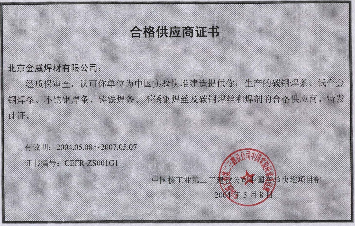 中國核工業第二三建設公司合格供應商證書